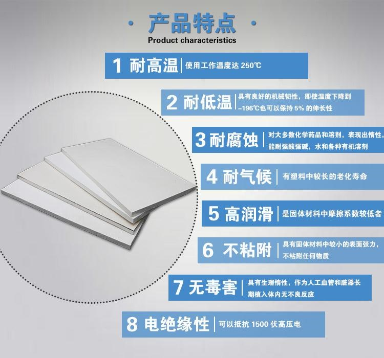 聚四氟乙烯板(也叫四氟板,鐵氟龍板,特氟龍板)分模壓和車削兩種,模壓板是由聚四氟乙烯樹脂在常溫下用模壓法成型,再經燒結、冷卻而制成。聚四氟乙烯車削板由聚四氟乙烯樹脂經壓坯、燒結、旋切而成。其制品用途廣,具有極為優越的綜合性能:耐高低溫(-192℃-260℃)、耐腐蝕(強酸、強堿、王水等)、耐氣候、高絕緣、高潤滑、不粘附、無毒害等優良特性。